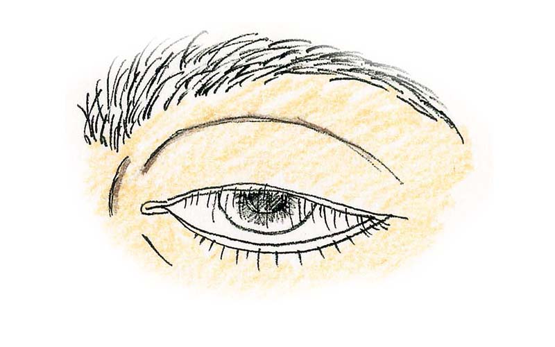眼瞼下垂とはまぶたが思うように挙がらないことで黒目の一部、あるいは大部分を覆い隠してしまう病気です。視野が狭くなることでうっとうしく感じたり、頭痛や肩こりなどの様々な症状を引き起こします。また眼瞼下垂の患者様は常に「眠たそうな」印象になります。沖縄の方言ではそのような顔貌を「ニーブヤー」と言うため、当院では多くの患者様は「ニーブヤー」を治療したいと来院されます。眼瞼下垂には大きく分けて先天性と後天性の2種類があり、前者は生まれつき、後者は主に加齢などによるもので、まぶたを引っ張る腱膜の異常・余剰皮膚が原因・神経の異常など様々な病態によるものがあります。