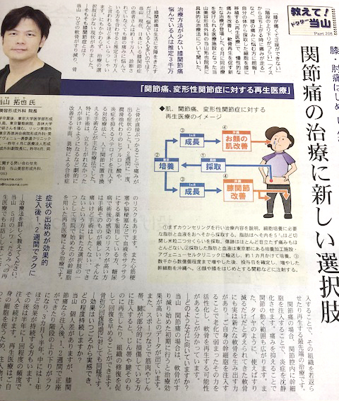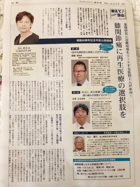 7月26日タイムス住宅新聞社の取材を当院の院長が受け報告しております。これによってこれ迄ヒアルロン酸の関節注入の他にもうひとつ画期的な治療が沖縄でも出来るようになったと云う事です。